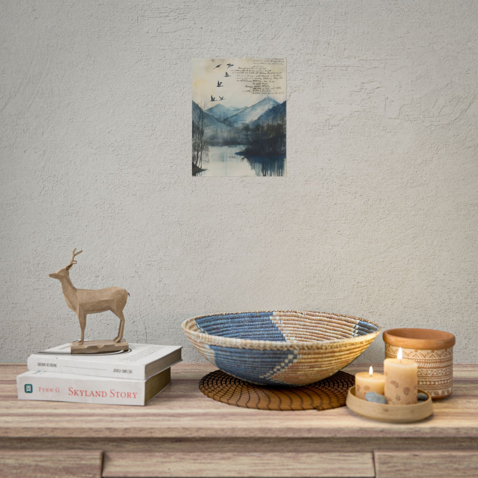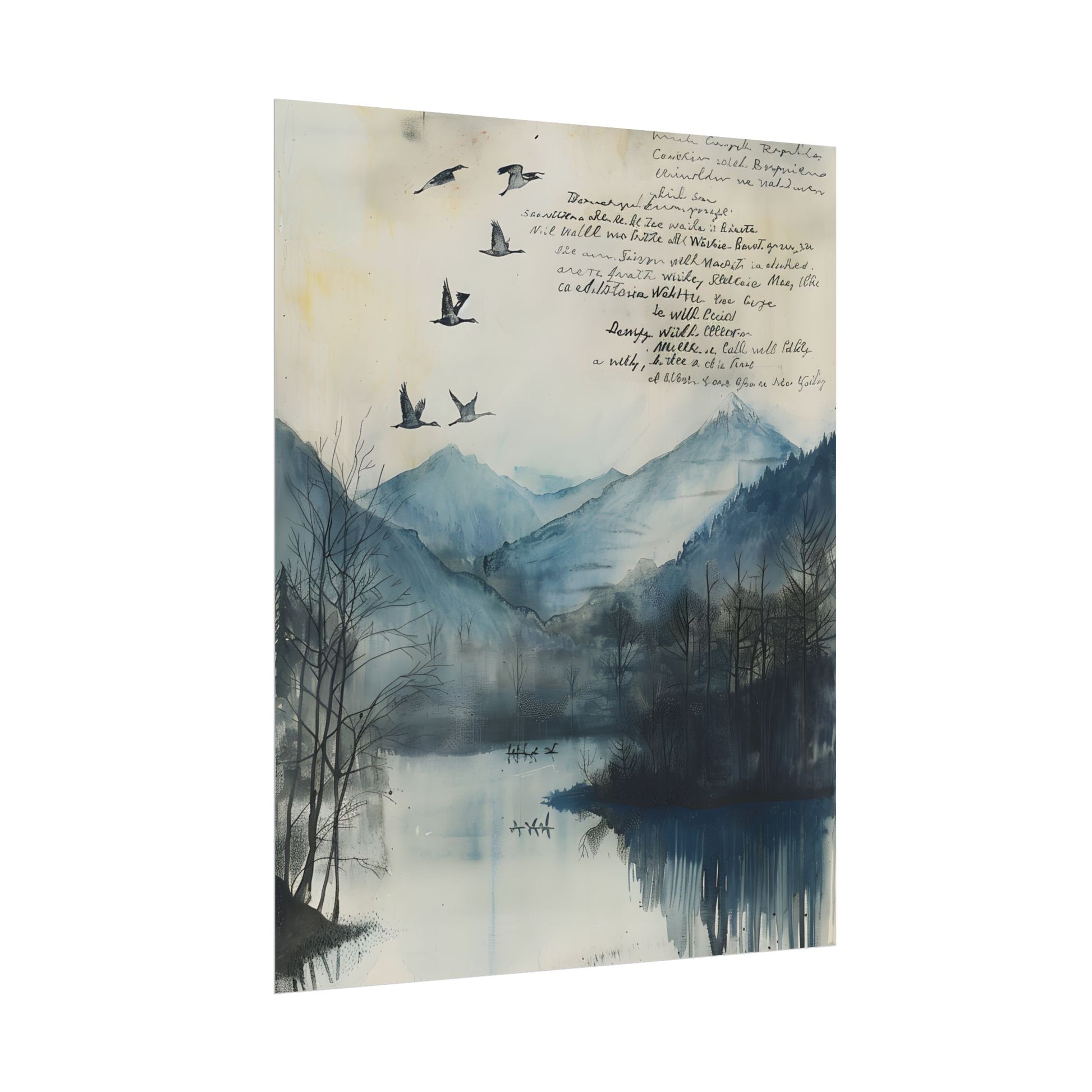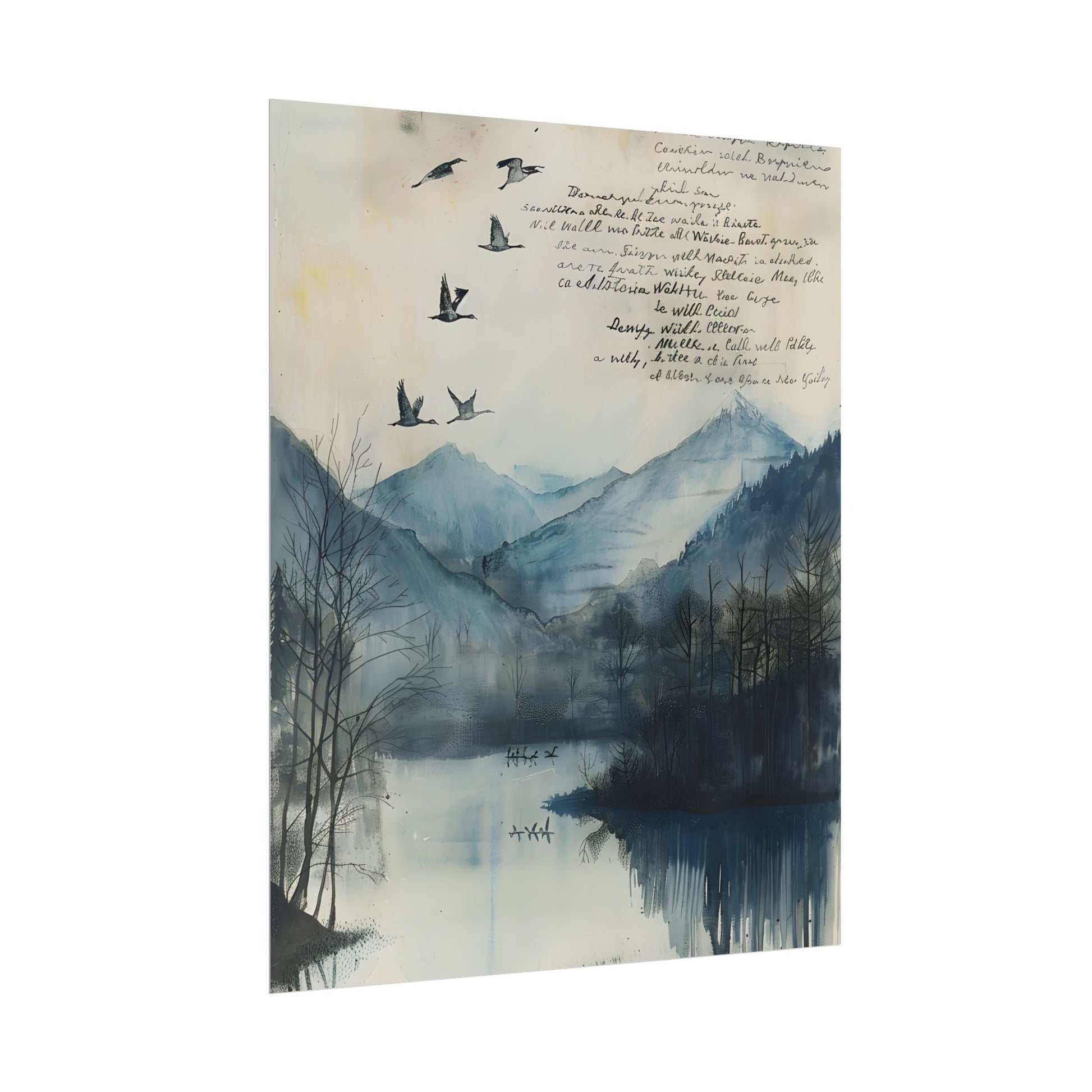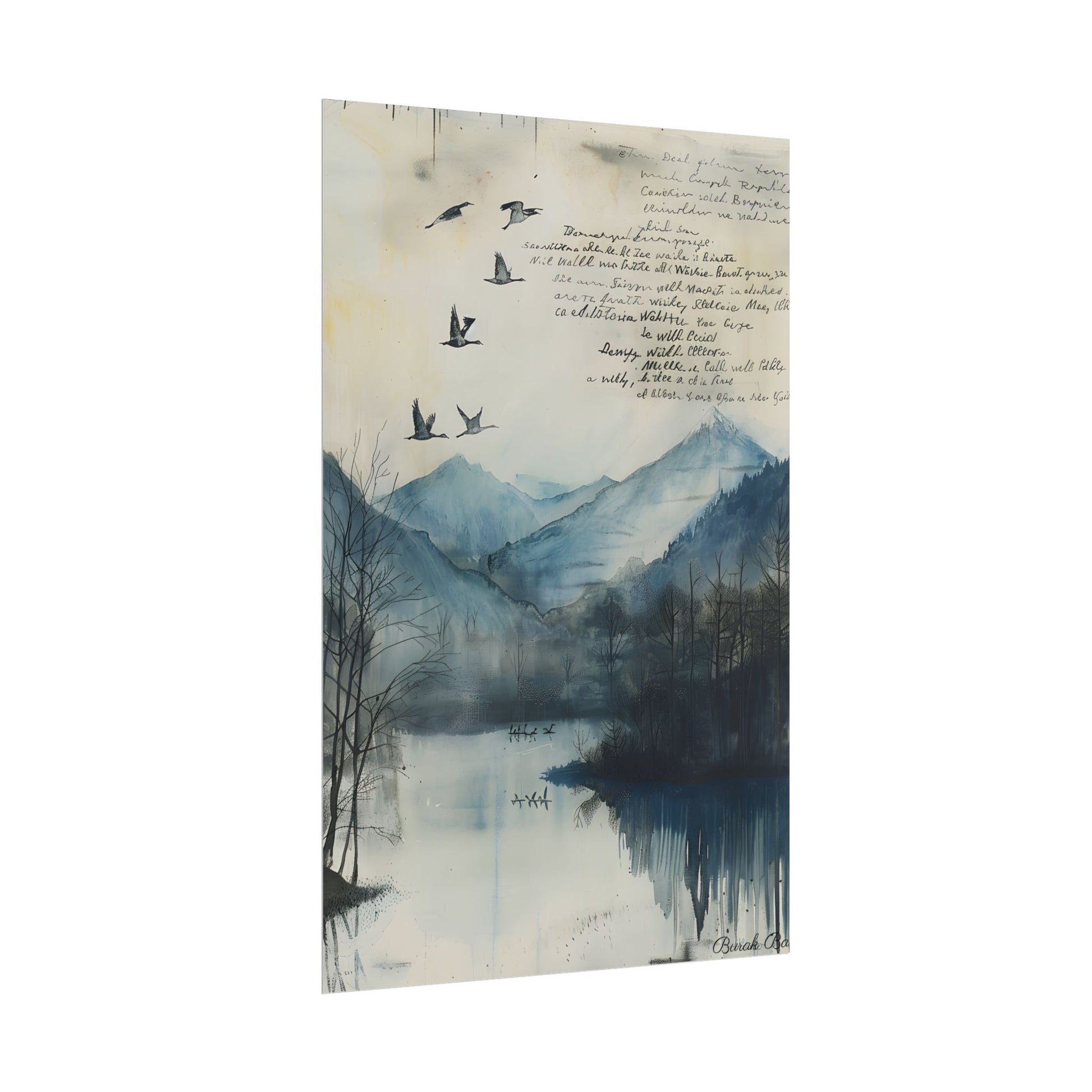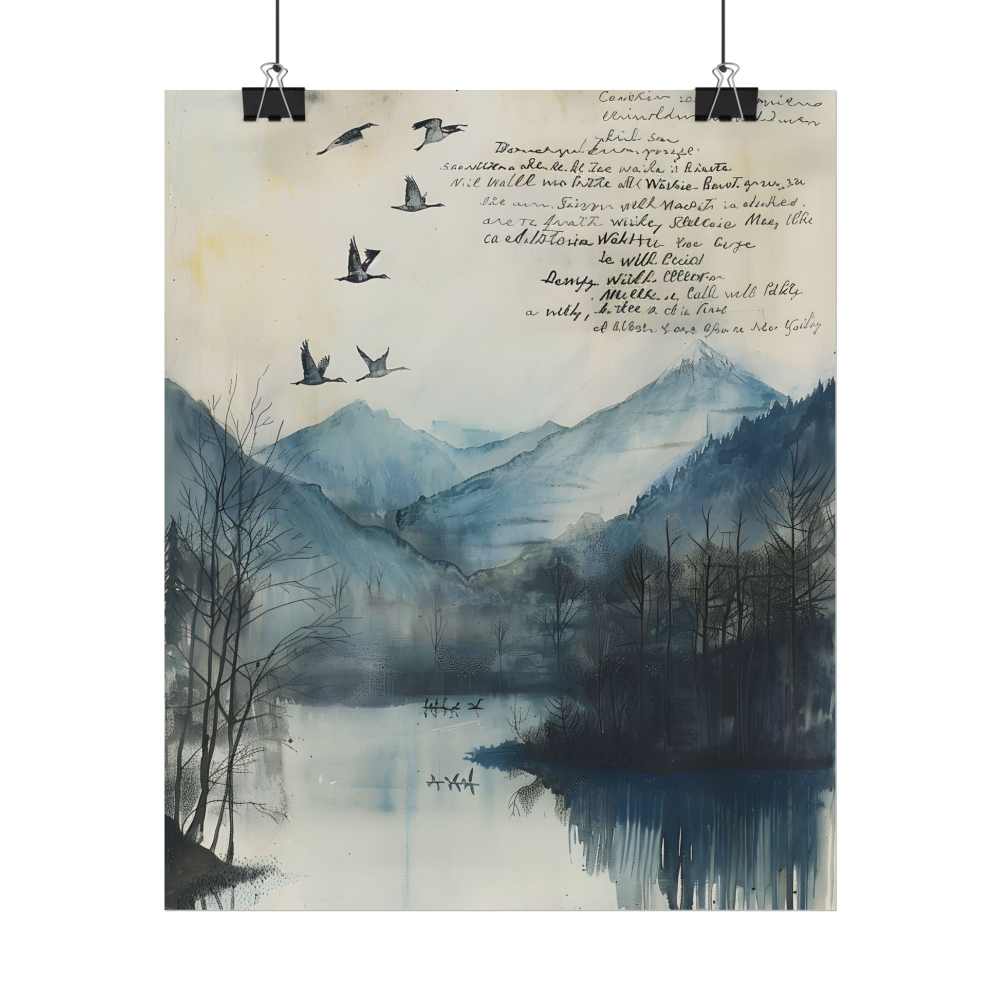 Escape to a serene world with Nature's Serenity: Mountain Lake Birds in Flight Artwork. This stunning 24x36 inch poster captures the beauty of a mountainous landscape, a tranquil lake, and majestic birds soaring in the background, all set against a clear blue sky. Printed on high-quality matte paper, this artwork is perfect for nature enthusiasts and anyone seeking to add a touch of serenity to their home or office decor.